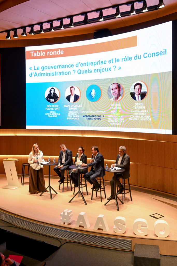 La seconde table ronde a abordé les enjeux de la gouvernance d’entreprise et le rôle des conseils d’administration, avec les regards croisés de Bénédicte Hautefort, CEO et cofondatrice de Scalens et administratrice de JCDecaux, Jean-Charles Simon, Délégué général de Paris Europlace, Cédric Lavérie, Head of French Research chez Institutional Shareholder Services, et Denis Terrien, Président de l’IFA et administrateur expérimenté.